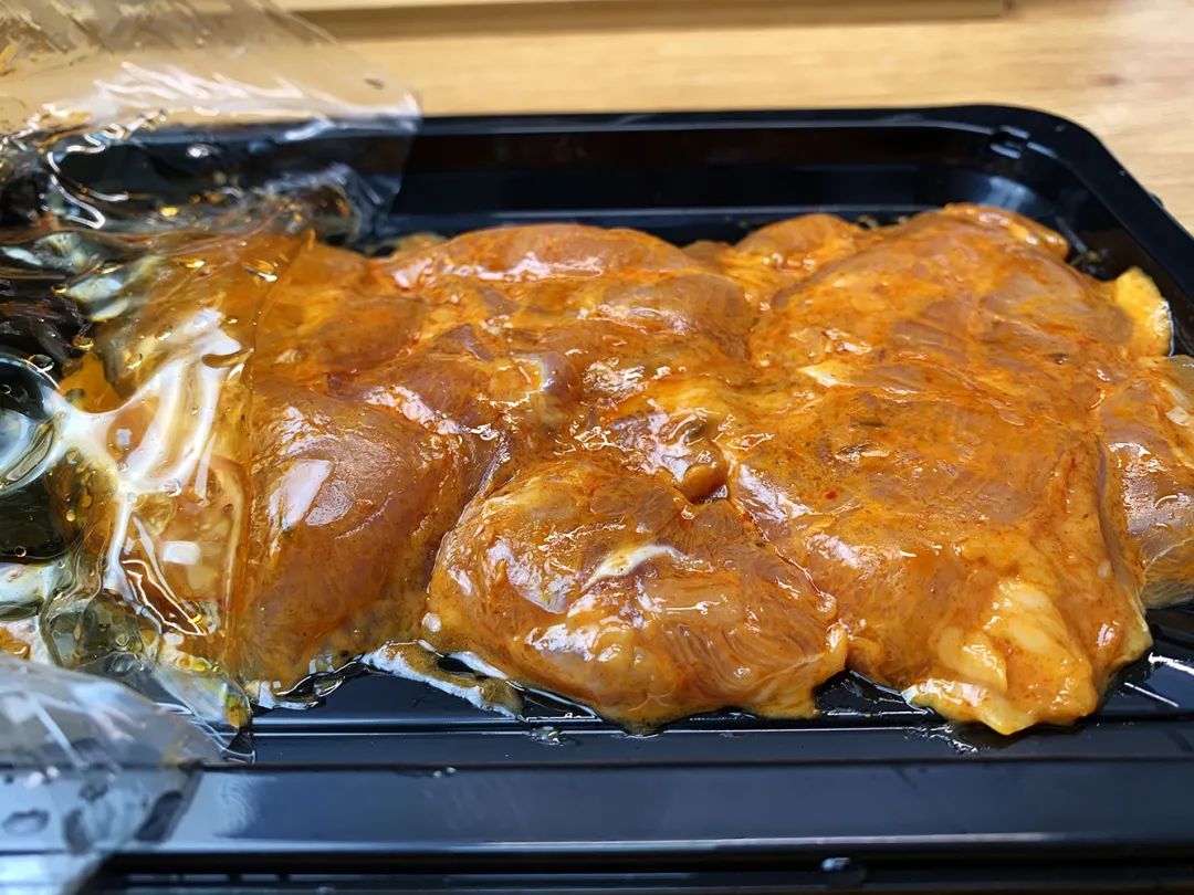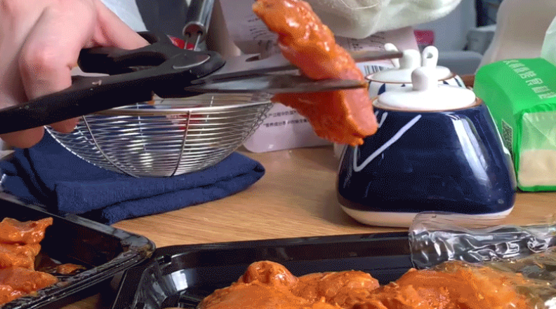 整盒鸡腿肉块的包装膜刚撕开,一股浓郁的辣条香就飘了出来,和小时候的味道一模一样;被调料包裹的鸡腿肉透着红润色泽,它的嫩肉眼可见!用筷子轻轻按压,能感受到鸡肉的弹。