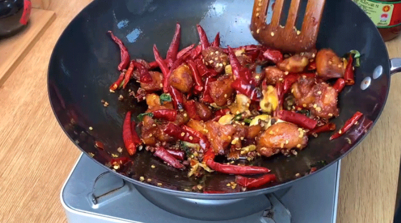 放入辣椒爆炒后,鸡腿肉吃起来外皮焦香、辣味十足,内里却细嫩紧实,还会出汁。