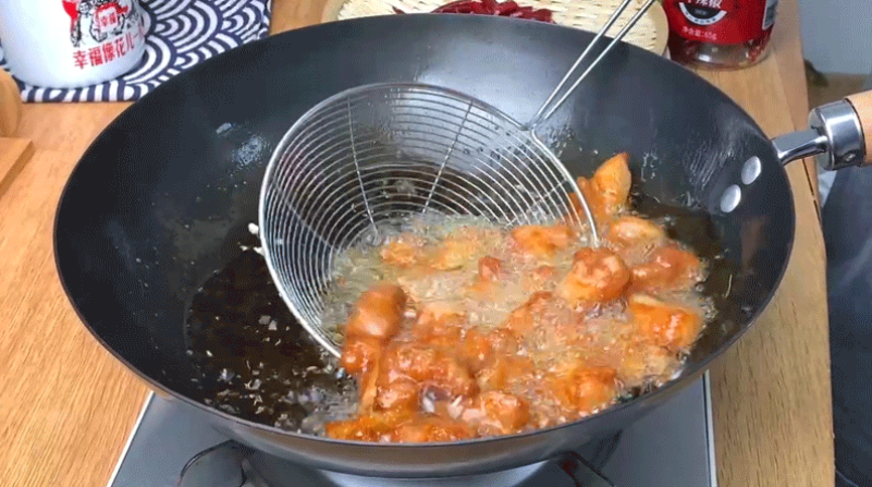 鸡腿丁下锅稍一油炸,辣条香混着肉香就飘满整屋,鸡肉慢慢变得焦黄,炸好出锅后鸡肉大粒鲜香,油炸后也不缩水。