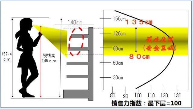 同一种类的商品请沿着黄金陈列线竖着排列,这样顾客能够在醒目位置浏览多个品类的商品,并进行横向对比,快速找出替代品购买。