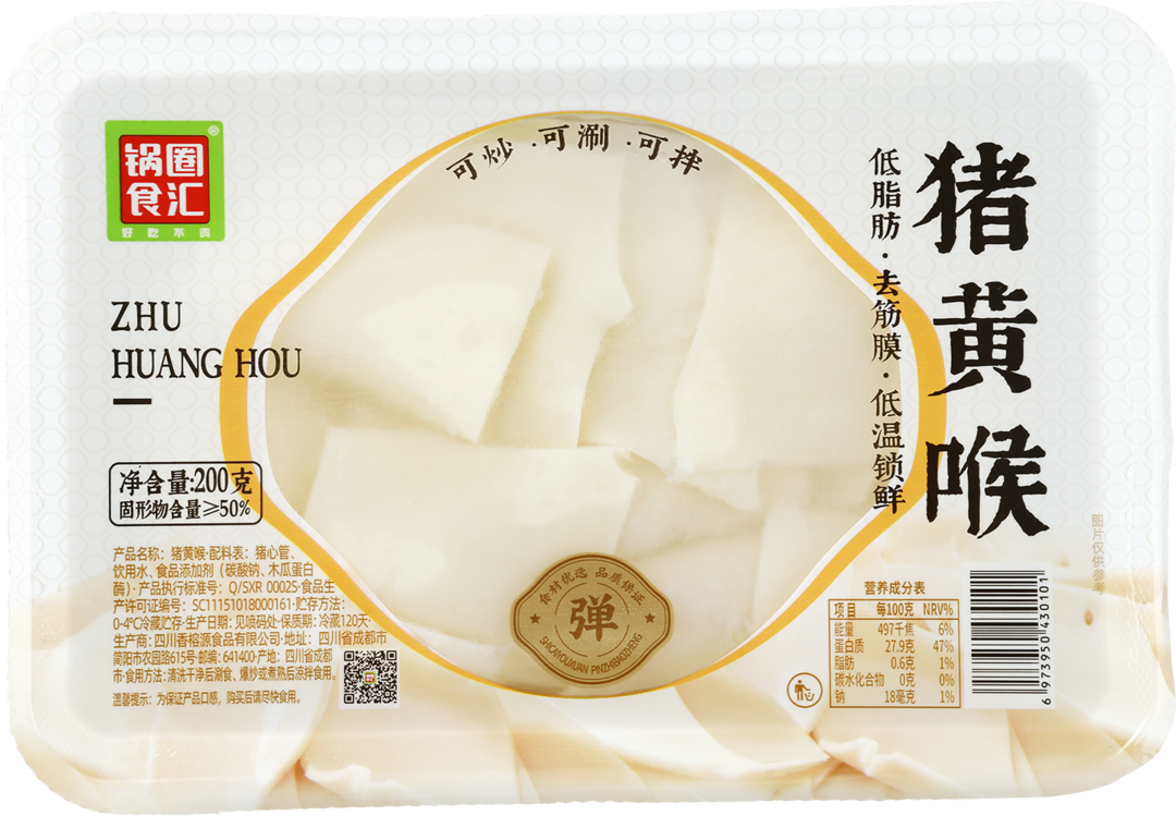 平时黄喉的吃法大家都是涮煮为主,但其实黄喉早已被吃货们吃出了花儿:香辣黄喉、脆椒黄喉丝、凉拌黄喉......由于黄喉嫩脆鲜香的特质,无论怎么折腾都是一道美味。 而且锅圈猪黄喉加工时已去掉筋膜,带回家开袋就能直接加工,省去清洗和去腥环节,方便又美味。