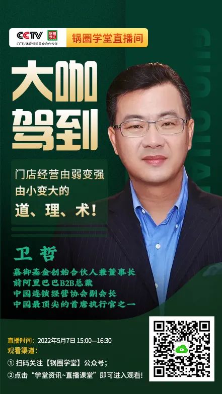 除了是锅圈直播间重磅大咖,嘉御基金的卫哲老师还是锅圈投资人之一。在嘉御基金投资锅圈的2年里,他多次近距离接触锅圈门店,对于门店情况,他极为熟悉。5月7日15:00-16:30的这场直播,可以说是卫哲老师为锅圈门店量身打造!多年管理经验的重磅大咖、量身定制的直播内容,如果这次错过,下次就不知道什么时候能有幸邀请到卫哲老师再次分享了! 门店运营是场“修行”,需要我们持续不断地去学习、在实践中积累经验。除了本期邀请到嘉御基金的卫哲老师前来直播外,我们还会持续邀请更多行业大咖来为门店赋能! 另外,每周四下午我们都会邀请具有丰富实战经验的优秀店长和加盟商进行门店运营分享!让优秀复制优秀! 每一个重磅嘉宾的分享,都会让我们少走弯路,他们的经验为我们筑垒了成长的高墙,让我们能踩在巨人的肩膀之上,更早赢得成功。 期待更多嘉宾来到锅圈学堂直播间,期待每个人都能在直播间收获满满!