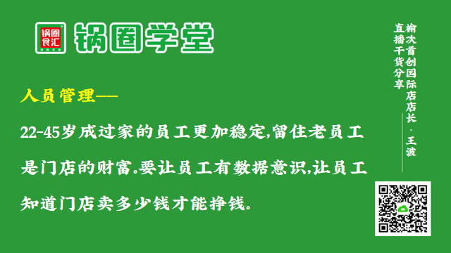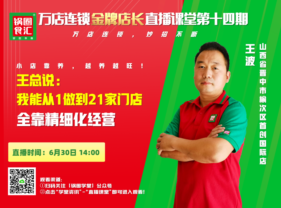 6月30日14:00——15:00,锅圈山西加盟商王波做客锅圈学堂万店连锁金牌店长直播间,分享他的精细化经营秘诀。