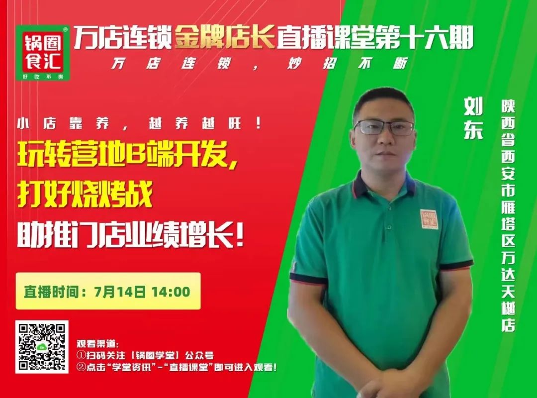 7月14日14:00——15:00,锅圈陕西省西安市雁塔区万达天樾店刘东做客锅圈学堂万店连锁金牌店长直播间,分享他的B端营地开发秘诀。