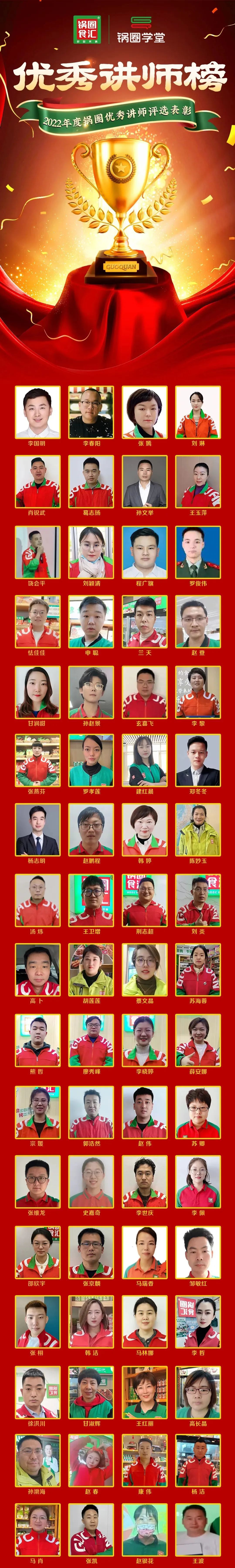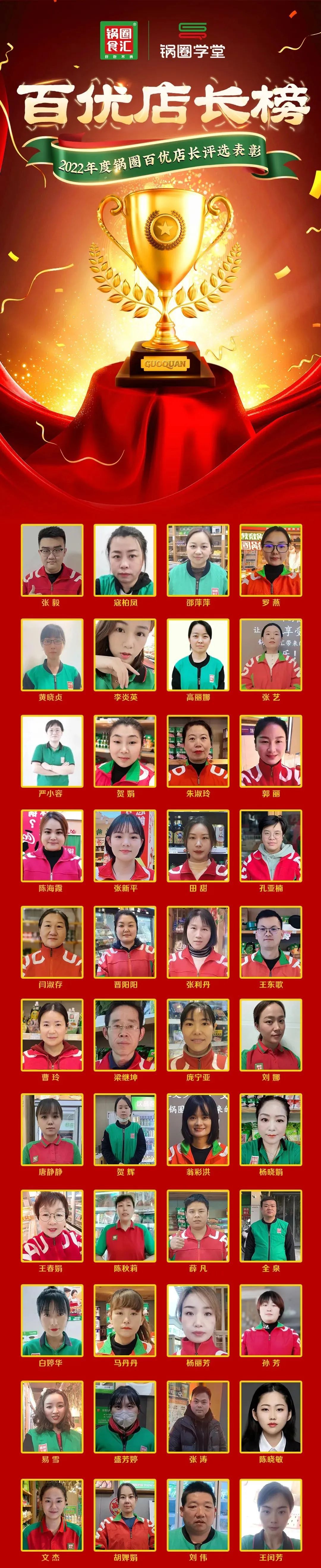 锅圈梦想,树标杆风向。锅圈年度评优评先从全国的优秀门店、一线员工中优中选优,同时评选出百优店长榜、百优门店榜、优秀讲师榜,旨在传承锅圈企业文化,彰显锅圈利他的核心价值观,让所有锅圈人都能学习优秀、鼓励优秀,积极向上,拼搏进取,打造百花齐放的学习型组织,复制宝贵的运营经验,助力门店业绩持续增长,促进省公司、加盟商、店长“三融合”的发展,助推锅圈事业蒸蒸日上。 2022年度锅圈全国评优评先活动由锅圈学堂发起并对评选过程进行监督,由总部各业务条线负责人及大区总组成评优评先小组,在总部线上线下运营、食安、督查、合规、市场、BI等多部门协同参与下,评优评先工作顺利完成各项议程并圆满落下帷幕!此次评选工作历时近一个半月,收到了来自全国各地锅圈人的踊跃提报,从数千优秀的提报者中,甄选出了一批百优获奖门店、店长、兼职讲师。获得荣誉的门店、店长、讲师,还同时获得了奖金、抖音直播间扶持、更多的学习深造机会等一系列奖励。