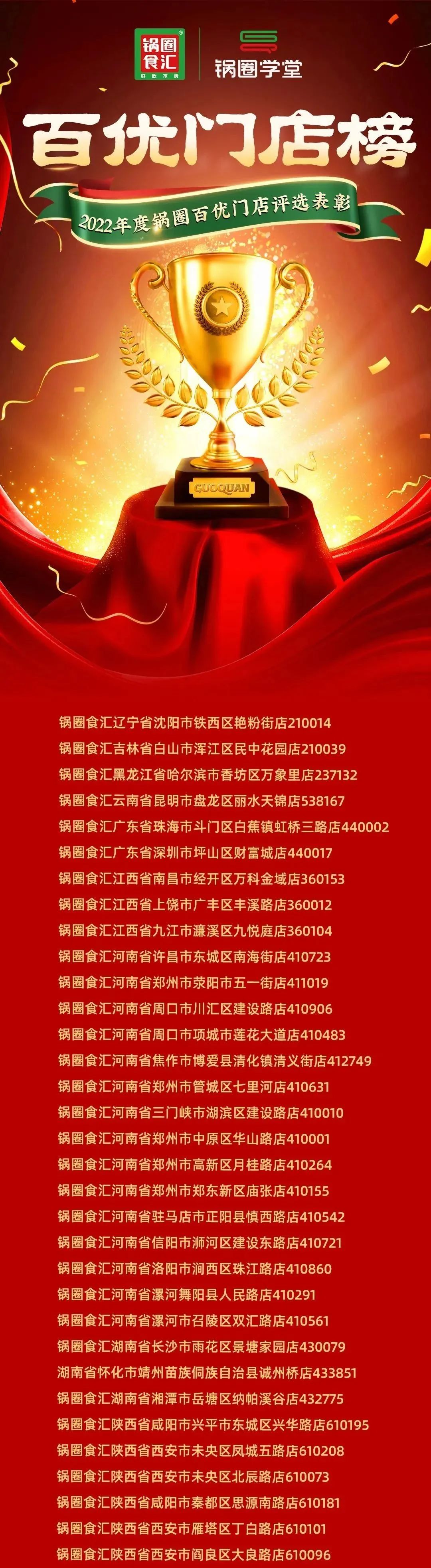 02 百优门店榜 为了表彰2022年全国各地涌现的优秀门店,本次评优评先活动特对本年度在成效经营、创造品牌价值、弘扬锅圈正能量等方面的门店进行评优评先,优秀门店的评选指标包括五个维度,分别是业绩维度、标准化维度、助推员工增长、积极学习、特殊贡献。以下是百优门店榜单。