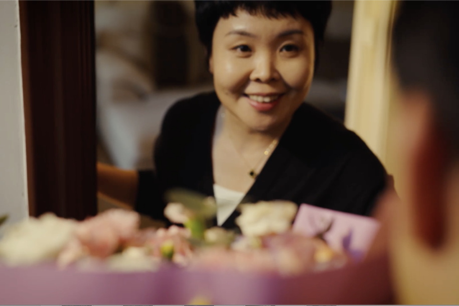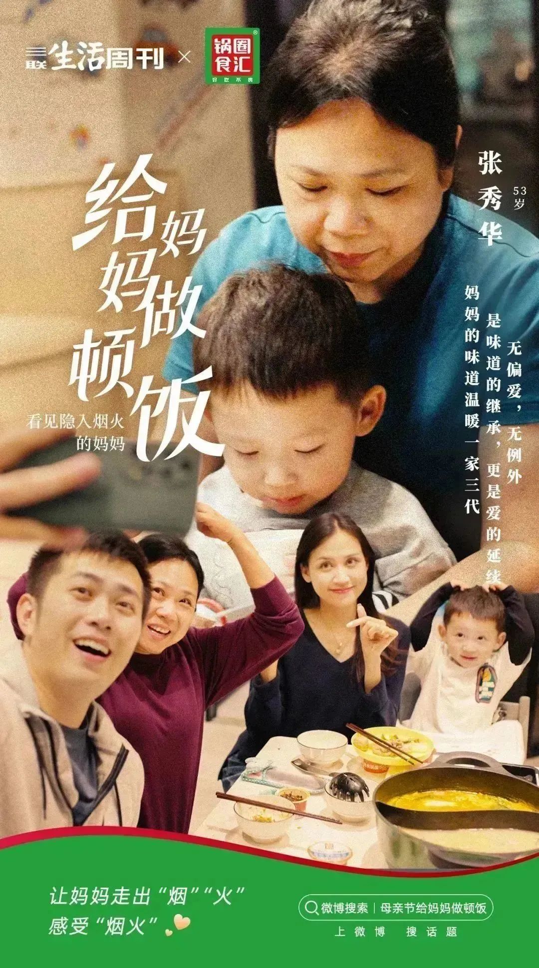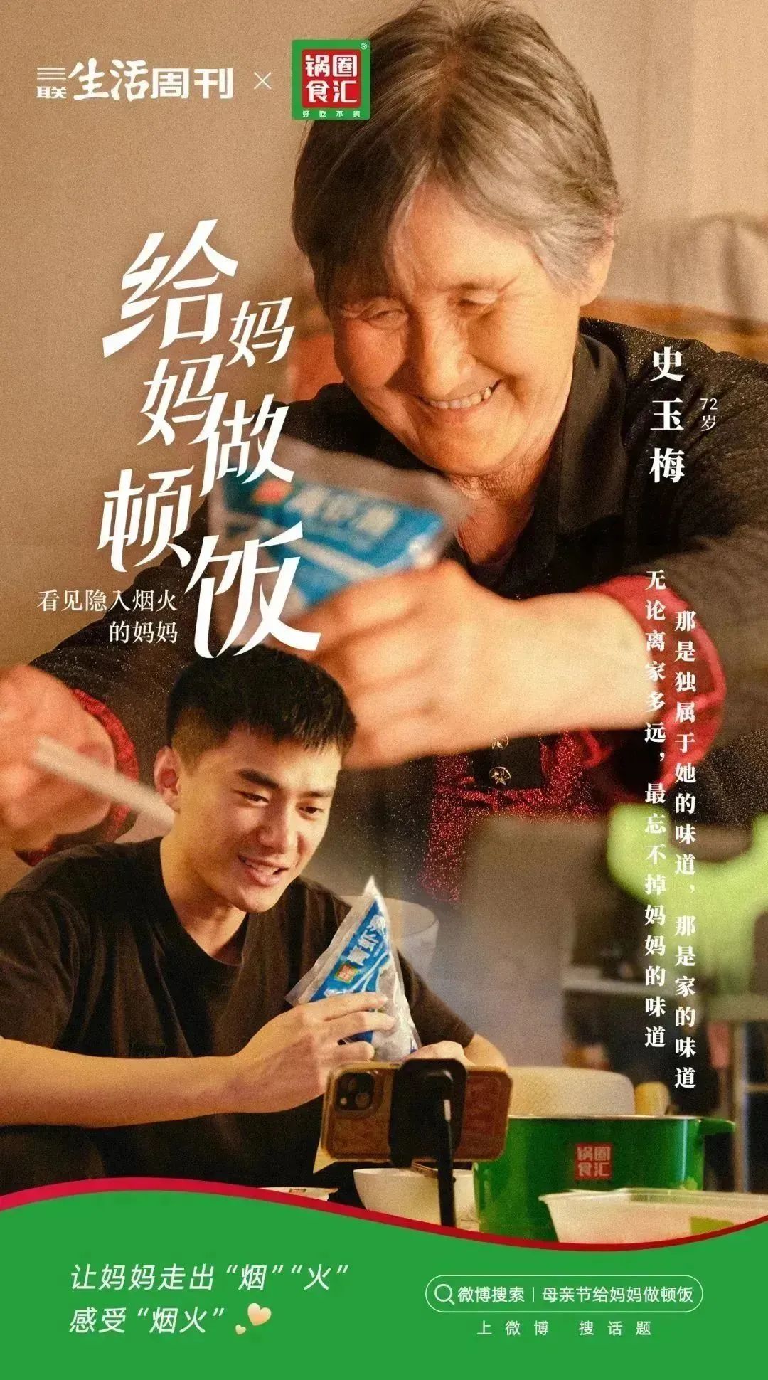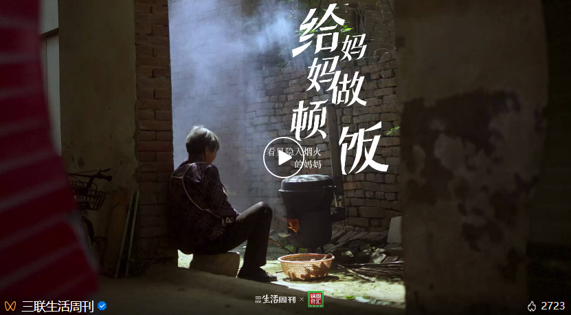 成为母亲之前,她们也曾是爱美爱笑的女孩 03 看见“隐入烟火”的母亲 子女可以用不同的方式“看见”母亲。在锅圈食汇和三联合作的这支视频中,其中一位主人公的妈妈刚刚年过七十,常年在河南老家,自己则北漂多年,相隔甚远。 去年放假,他本打算回家,但出发前两个小时突然收到主管的微信,原本安排好的工作出了紧急状况。他抱歉地打电话跟妈妈说这次回不去了,以后一定找机会回来。 然而,他并不知道的是,为了这一天,妈妈早早就推掉了和朋友们去跳广场舞的邀请,大包小包地从菜市场买回儿子爱吃的菜。放下电话,她一个人守着堆在厨房的食材发了好久的呆。 晚上从工作脱身之后,儿子看到妈妈回复的信息,心里一阵难过。坐电梯时,他偶然看见锅圈食汇的海报,决定下单和妈妈来一次“云聚餐”,兑现自己的承诺。视频里,他对妈妈说,自己非常支持她以后多去跟朋友们一起跳舞,就像母亲总告诉他的那样——”去勇敢地尝试吧,我会一直在你身边“。