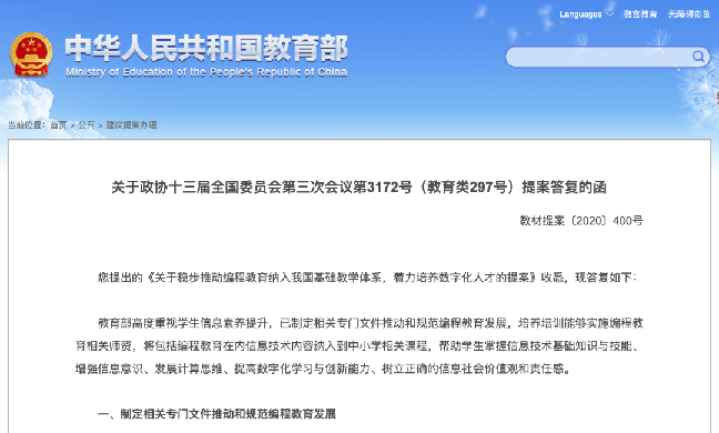 最近教育部已经正式在官网回复,将编程纳入中小学相关课程了,还一度冲上微博热搜。
