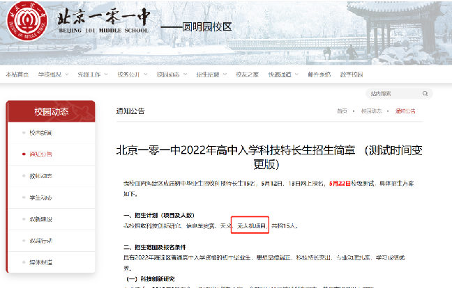 无人机项目也是北京多所学校科技特长生的招生项目。比如:2022年一零一中学的科技特长生招生简章,明确招无人机项目。