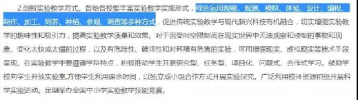文件还指出,"各地各校要丰富实验教学实施形式,综合运用观察、观测、模拟、体验、设计、编程、制作、加工、饲养、种植、参观、调查等多种方式"。