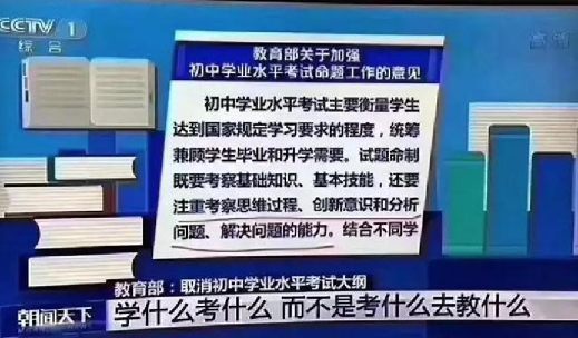 《考试命题意见》指出,取消初中学业水平考试大纲,促进学生认真学好每一门课程,完成好国家规定的义务教育学业,切实做到学什么考什么,而不是考什么去教什么、去学什么。